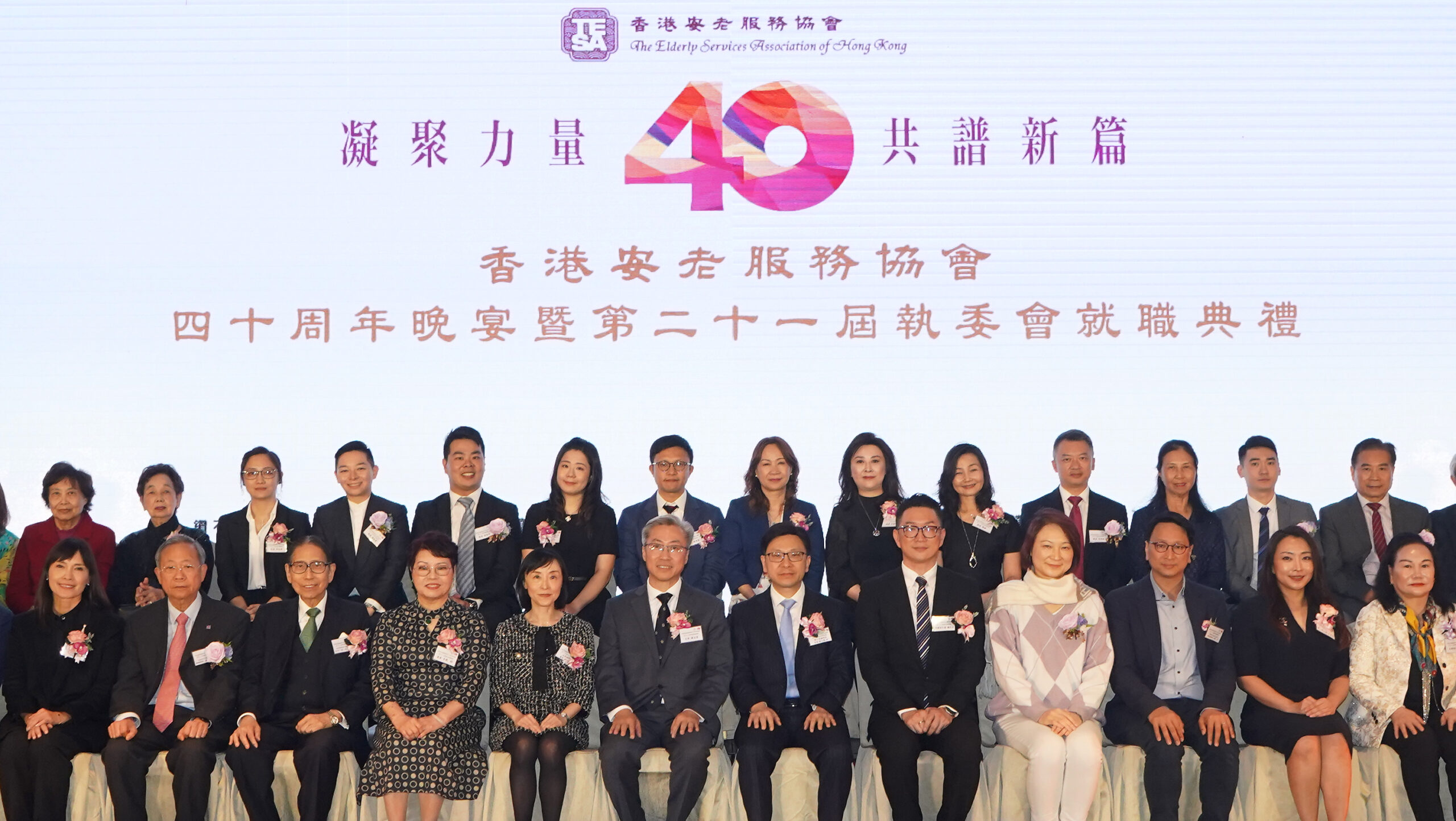 協會踏入40周年,亦是第二十屆執行委員會任期最後一年,為慶祝協會成立40周年及第二十一屆執行委員會誕生,於12月2日假座國際龍堡舉行「香港安老服務協會四十周年晚宴暨第二十一屆執委會就職典禮」,是次主題為「凝聚力量・共譜新篇」,有幸邀請到勞工及福利局局長孫玉菡作主禮嘉賓,亦感謝第十四屆全國人民代表大會常務委員會委員及港區全國人大代表李慧琼, GBS, JP、立法會議員江玉歡、立法會議員鄧家彪, BBS, JP、立法會議員黎棟國, GBS, IDS, JP、前安老事務委員會主席梁智鴻醫生, GBM, GBS, OBE, JP以及社會福利署署長李佩詩, JP出席,令晚宴生色不少。