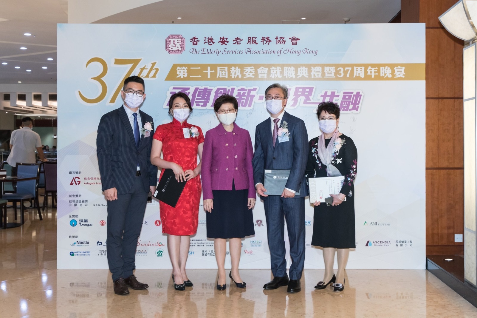 第二十屆執委會就職典禮暨37周年晚宴 2022-01-112020-11-20 作者 es@dmin 第二十屆執委會就職典禮暨37周年晚宴於11月18日完滿結束,本會非常感謝百忙之中撥冗出席的主禮嘉賓,包括行政長官林鄭月娥女士、勞工及福利局局長羅致光博士、社會福利署署長梁松泰先生、安老事務委員會主席林正財醫生、協會名譽會長梁智鴻醫生以及立法會議員、港區全國人大代表暨實政圓桌召集人田北辰先生,以及一眾嘉賓及會員機構,令是次晚宴生色不少。 再次感謝行政長官林鄭月娥女士頒發本會第二十屆執委會之選任證書,各執委定必竭盡所能,繼續帶領業界走進科技優化之嶄新時代。