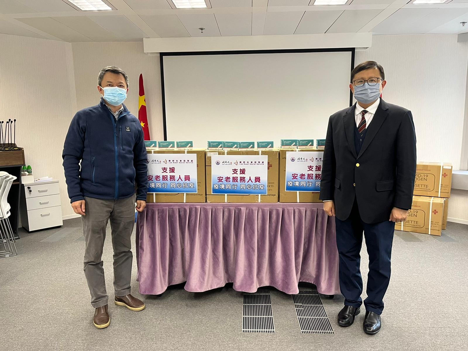 香港第五波新冠疫情嚴峻,安老院舍確診個案不斷上升,抗疫物資嚴重不足下,協會有幸得「香港再出發大聯盟」熱心捐贈約3000份快速抗原檢測包給安老院舍,以解燃眉之急。執委吳煒毅昨日(23日)親身前往「香港再出發大聯盟」辦公室,向立法會議員、大聯盟副秘書長黃英豪表達謝意,感激在抗疫物資匱乏下施以援手,幫助業界渡過難關。