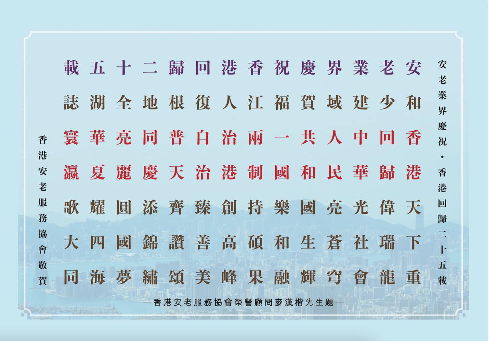 藉著普天同慶的日子,香港安老服務協會榮譽顧問麥漢楷勳賢BH,MH,並以「安老業界慶祝香港回歸二十五載」為題,慶賀香港回歸中華人民共和國二十五載、寄予香港老少安和、社會共融,在一國兩制、港人治港、高度自治的制度下,香港必定能再創高峰——「五湖華夏耀四海、載誌寰瀛歌大同」。